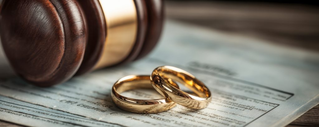 A judges gavel is placed next to two gold wedding rings on a legal document. This scene represents the connection between marriage and legal processes. The warm tones add depth to the setting.